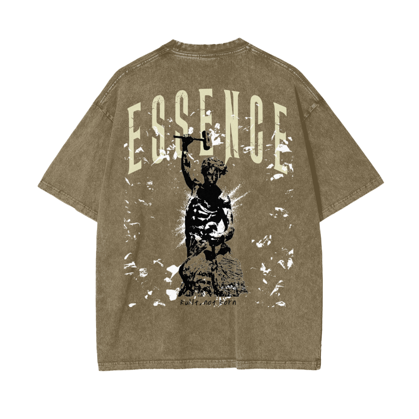 “Built Not Born” — a statue clawing its way out of raw stone. Heavy wash, heavyweight feel, heavyweight mindset. Wear the grind.